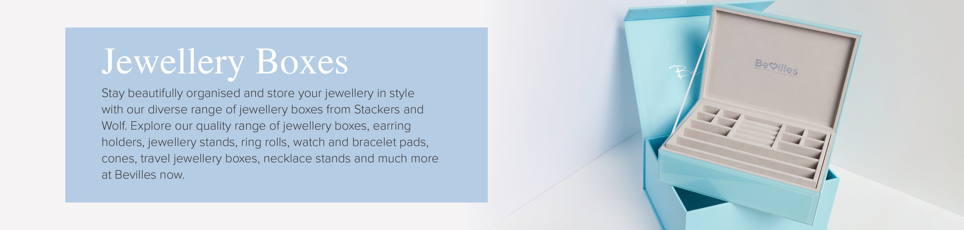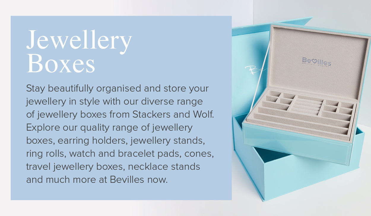 At Bevilles, we offer an exquisite selection of jewellery boxes designed to keep your treasured pieces safe and organised. Whether you need a compact solution for daily wear or a larger option for an extensive collection, our range of jewellery storage options caters to every need.
