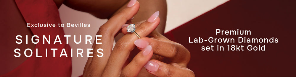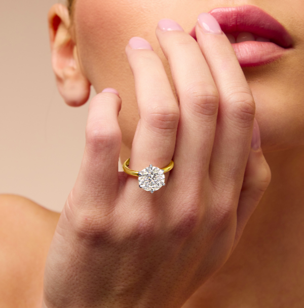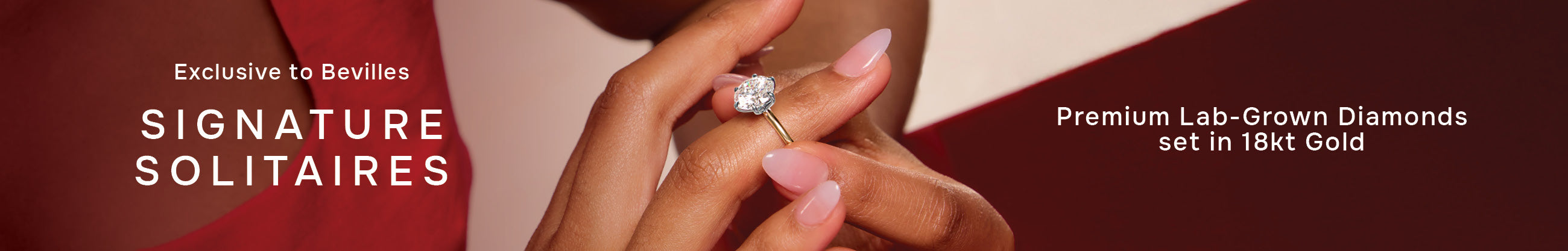 Exclusive to Bevilles Jewellery, 18kt yellow and white gold Signature Solitaire engagement rings feature lab-grown diamonds in F colour and VS clarity, secured with strong 6-claw Tiger prongs.
