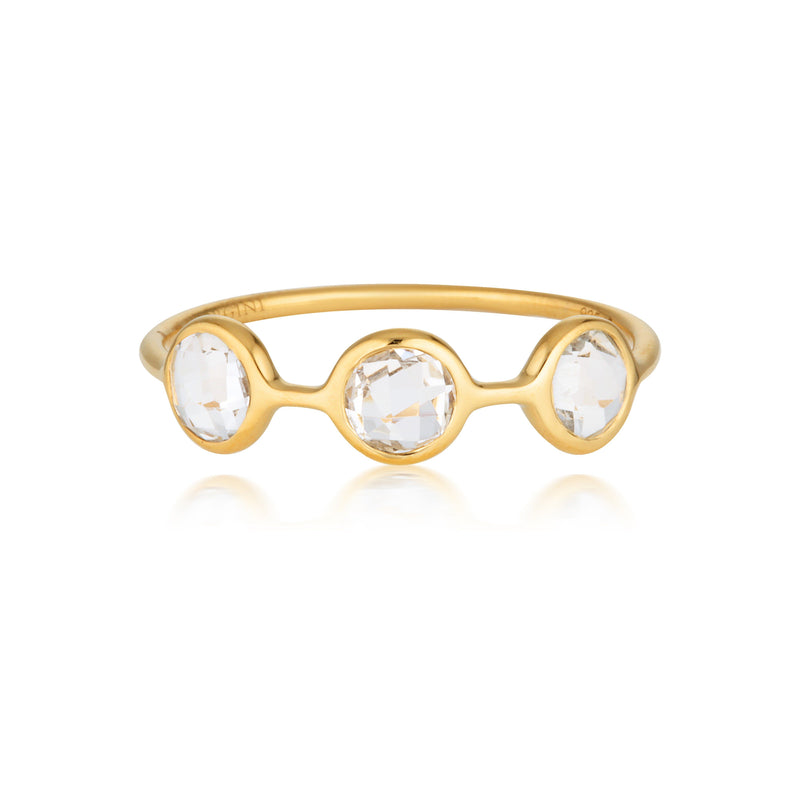 Glam up your everyday style with our gemstone collection three stone ring. Featuring a perfect mix of high shine gold plated silver and sparkling white topaz gemstones these earrings exude effortless glamour! Symbolizing hope, love and happiness these earrings tick all the boxes for feel good energy!